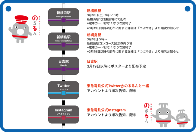 配布場所1. 3月18日(土)7:00~東急新横浜駅北口東広場でQR付電車カードにて配布(限定3,000枚、※なくなり次第、配布終了 ) 2. 3月19日(日)初電~4月17日(月)終電新綱島駅・日吉駅改札外のQR付掲出ポスターにて配布