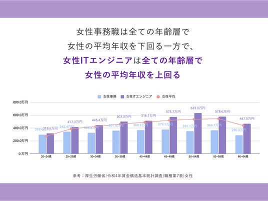 Ms.Engineerは創業以来、ハイスキルな技術を持つ女性ITエンジニアの育成に従事しています。令和4年賃金構造基本統計調査によると、現在も女性の転職先として人気の多くの事務職は全世代で日本女性の平均年収を下回る一方で、女性エンジニアは全年代で女性の平均年収を上回ります。