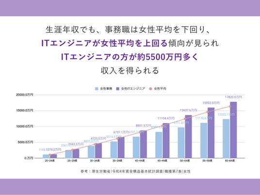 生涯年収を比較すると、エンジニアは事務職よりも約5500万円多く収入を得られる※3 ことが確認でき、転職におけるキャリア選択が女性の経済的自立と長期的な財政安定に影響を与えることを示唆しています。