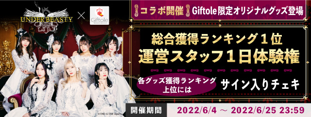 皆様に『小さな幸せ』を届けるTSUTAYAオンラインゲーム Giftole(ギフトーレ)と、アンダービースティーが強力コラボレーション!TSUTAYAオンラインゲーム Giftole(ギフトーレ)限定オリジナルグッズを全4商品ご用意しました。また、コラボを記念して「運営スタッフ1日体験権 ハーレムチェキ付き」が手に入るスペシャルイベントを開催いたします!