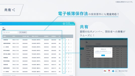 「PICKFORM 案件管理」を利用すれば、関連ファイルがすべて格納されているため、そこからワンクリックで相手方に共有することが可能です。