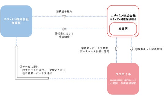 この取り組みは、ニチバン健康保険組合および産業医とも連携し、心疾患のリスクが高い場合に、「検査を受けてから医療機関を受診するまで」をスムーズに行う体制を構築します。