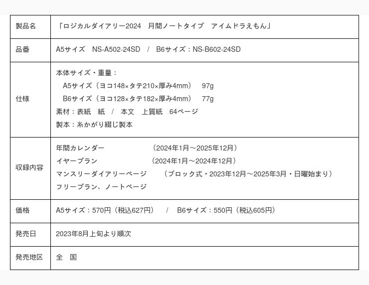 ナカバヤシ株式会社(本社:大阪市中央区、社長:湯本 秀昭)は、 本文罫に“ロジカル罫”を使用した『ロジカルダイアリー』シリーズから、「ロジカルダイアリー2024 月間ノートタイプ アイムドラえもん」を2023年8月上旬より順次全国にて発売します。