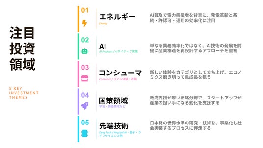 一方、3号ファンドでは、従来強みとしてきたソフトウェア・テクノロジーやコンシューマ領域に加え、エネルギー、宇宙・防衛、先端技術といった国家レベルの構造転換領域にも本格的に踏み込みます。2024年12月にファンドの組成を開始して以降、既に有望スタートアップ15社に対して投資を実行しております。