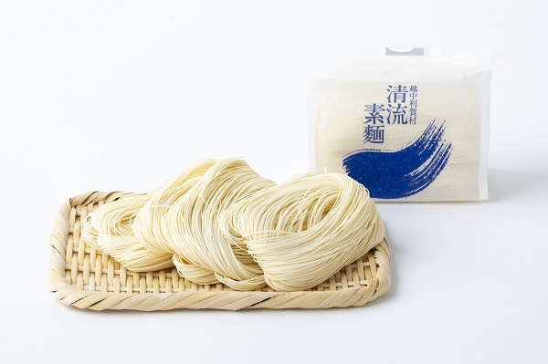 富山県の南西部、標高1,000mを超える山々に囲まれた秘境「利賀村」で、清流百瀬川の水と厳選した粉を使い、昔ながらの手延べ製法で4日間ゆっくり乾燥。手まり型の麺を食べやすい大きさに割って茹でます。長時間経過しても抜けないコシと、のど越しのよさが特長です。