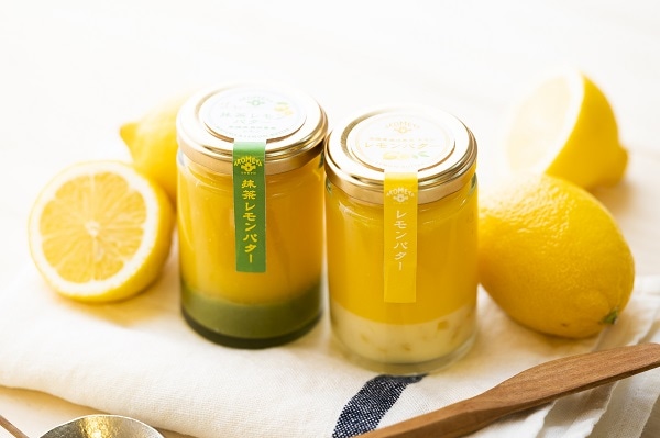 レモンピールを加えたミルクカードとレモンカードが二層になった「レモンバター」と、国産抹茶にレモンカードが重なった「抹茶レモンバター」の2種類。アイスクリームやヨーグルトに添えたり、パンやクラッカーに塗っても。