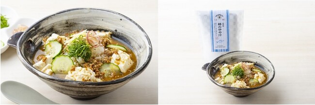 宮崎の郷土料理をもとにした冷や汁。鮮度のよい国産の真鯵を水揚げ後すぐに下処理し、一度干した後に焼いてからすり身にしているので、真鯵の旨味がていねいに引き出されています。