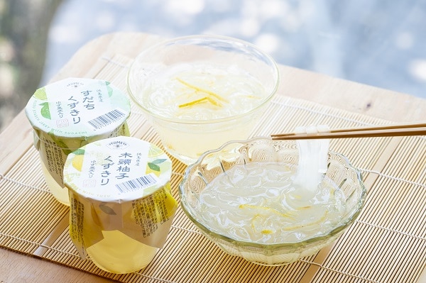 農薬不使用の徳島県産木頭柚子とすだちを使った、ところてんタイプのくずきり。つるんとした食感とすっきりした風味が爽やかです。
