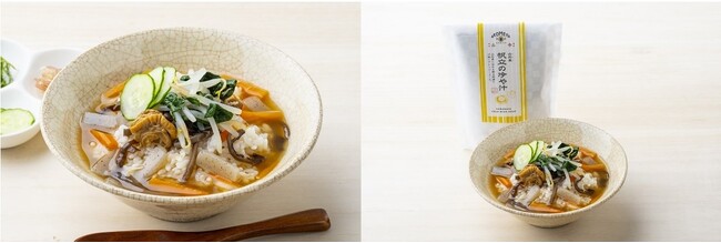 山形県米沢地域の郷土料理「冷や汁(おひたし)」をもとにした冷や汁。「帆立界の大トロ」と呼ばれる陸奥湾産の帆立を具と出汁に使用し、こんにゃく、きくらげ、人参を合わせました。
