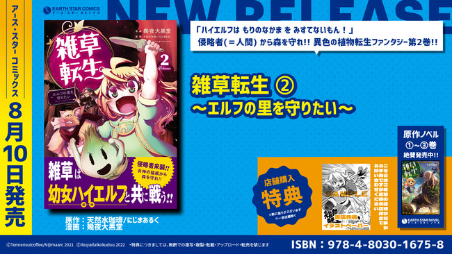 アース・スターノベルより刊行している人気ノベル作品が原作で、現在コミック アース・スターで連載中の人気作品『雑草転生 ~エルフの里を守りたい~』コミックス第2巻を8月10日(水)に発売いたします。
