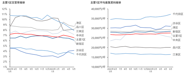 三菱地所リアルエステートサービス株式会社(本社:東京都千代田区大手町1-9-2、代表取締役社⾧:湯浅哲生)は、2023年5月度の東京主要7区(千代田区、中央区、港区、新宿区、渋谷区、品川区、江東区)の大規模ビル※1のマーケットデータをまとめた「空室率レポート」を本日、6月9日に公表します。