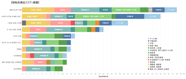 新橋・虎ノ門・汐留エリアへの移転実施業種内訳は、昨年度全体の移転実施業種内訳と概ね同じ傾向にあるが、西新宿エリア、渋谷駅周辺エリア、品川駅周辺エリアでは、約半数を情報通信業が占めており、エリアの特色が窺える。