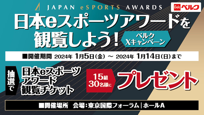 日本eスポーツアワード初開催を記念して2024年1月5日(金)~2024年1月14日(日)までの期間中、ベルク公式X(@belc_jp)と日本eスポーツアワード【公式】(@esportsawardsJP)の両方フォローのうえ、指定のポストをRP(リポスト)いただいた方の中から抽選で15組30名様に「日本eスポーツアワード観覧チケット」が当たるキャンペーンを実施いたします。