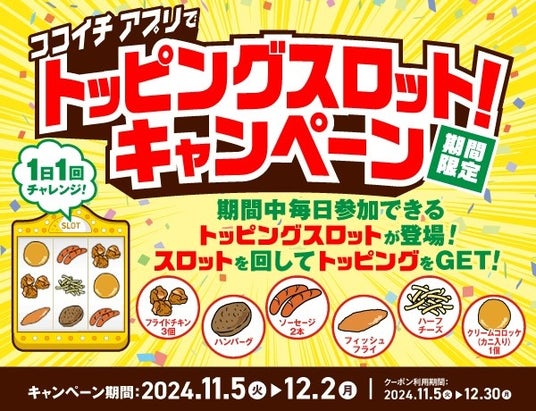 株式会社壱番屋(本社:愛知県一宮市、代表取締役社長 葛原 守)は、2024年11月5日(火)より、ココイチ公式アプリ内で「トッピングスロット!キャンペーン」を実施いたします。