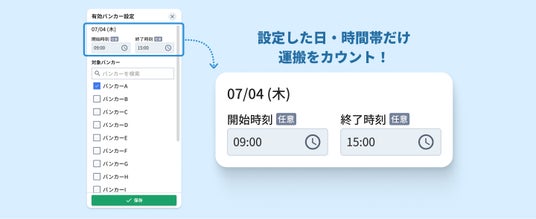 従来の位置情報による設定に加え、新たに「作業時間」を設定できるようになりました。例えば「Aバンカーは本日の9時~15時まで有効」と設定することで、その時間外に車両が接近しても運搬カウントされません。これにより、作業が完了したバンカーや隣接するバンカーへの誤判定による不要なカウントを完全に防ぐことができます。