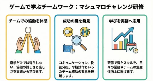企業は、実践的なワークを通じて、従業員にチームワークの要素(効果的なコミュニケーション、リソース管理、迅速な試行錯誤)を深く習得させたいという明確なニーズを持っています。株式会社リスキルは、このニーズに応えるため、ビジネスゲームを活用した「マシュマロチャレンジ研修」を開発しました。