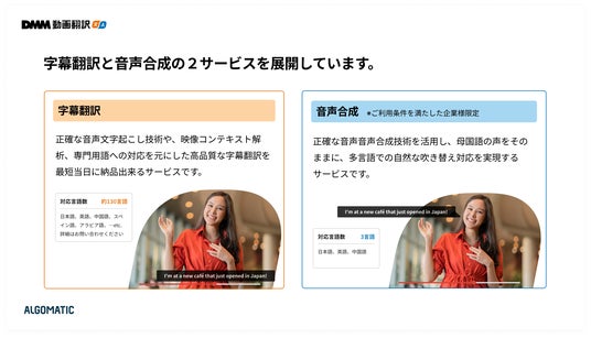 当社は2024年7月よりAI技術を活用した多言語動画翻訳サービス「DMM動画翻訳」の提供を開始、また8月にはゲーム特化の多言語翻訳サービス「DMM GAME翻訳」の提供を開始し、国内外のクリエイターや企業の国際展開の支援を強化しております。