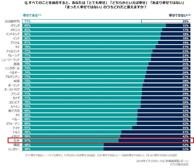 世界最大規模の世論調査会社イプソス株式会社(日本オフィス所在地:東京都港区、代表取締役:内田俊一)は、日本を含む世界30カ国23,269人を対象に、2024年イプソスグローバル「幸福感調査」を実施しました。