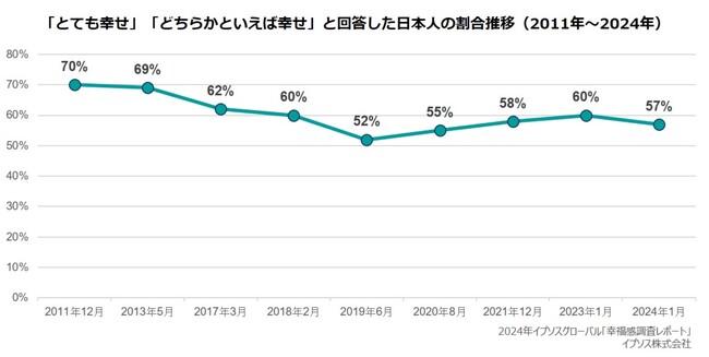 「幸せである」と感じている日本人は回答者全体の57%であり、対象国の中でも下から3番目という低さでした。また、本調査を開始した2011年の70%と比較し、13ポイント減少していることがわかりました。尚、この13年間では2011年の70%が最多回答でした。