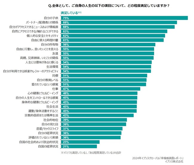 人生で満足している項目は1位が「自分の子供」、最下位は「自国の経済状況」(グラフ4.)