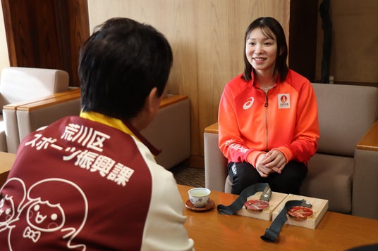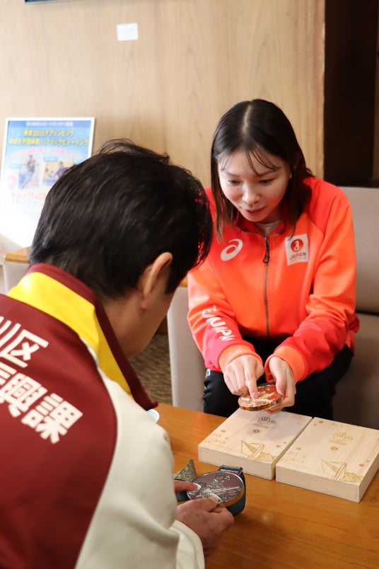 東京2025デフリンピック卓球競技女子団体で銀メダル、女子ダブルスで銅メダルを獲得した山田瑞恵(やまだ・みずえ)選手が、本日、荒川区の滝口学(たきぐち・がく)区長を表敬訪問し、結果の報告を行いました。山田選手は、「今大会では、『ミスしても大丈夫、笑顔でいよう』『デフリンピックは楽しみながら笑顔でやろう』と心に決めて試合に臨んだ結果、気持ちが上向きになって、目標を達成できたのかなと思っています。」と語ってくれました。
