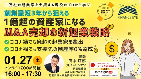 株式会社ファイナンスアイ(本店:大阪府大阪市、代表取締役:田中 琢郎。以下、ファイナンスアイ)は、M&A売却で1億超の資産家になる事を目指して独立・開業を目指すスタートアップや起業家に向けた創業セミナー【最短創業3年から狙える!1億超の資産家になるためのM&A売却の新起業戦略】を開催します。このセミナーでは、創業して最短3年からM&A売却のイグジットにより1億超の資産家になるための起業スキームを伝えます。事業そのものを一つの商品として売却するために、起業家は創業時からどのような事業計画を立案して、どのように実現すればよいのか。無計画でも思い付きやアイデアで実現できる天才もいるかもしれませんが、普通の人でも再現できる戦略とスキームがあります。1万社の起業家や経営者を支援し、コロナ禍でも億超の起業家を輩出し続けたファイナンスアイがリアルに再現してきた内容を伝えます。開催日時は2024年1月27日(土)16:00にウェビナー形式で開催します。年始に学び、2024年の成功に向けて躍進するきっかけにしてもらえればと思います。