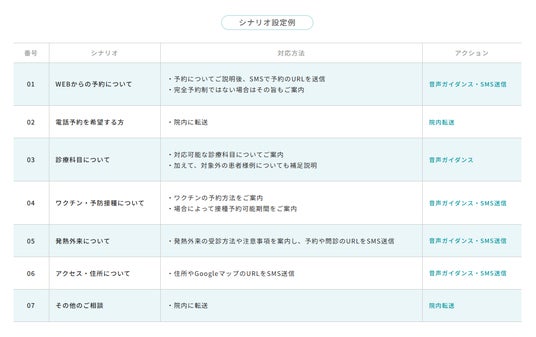 患者様がプッシュした番号に応じて、音声ガイダンスやSMS送信、医療機関様への通話が可能です。