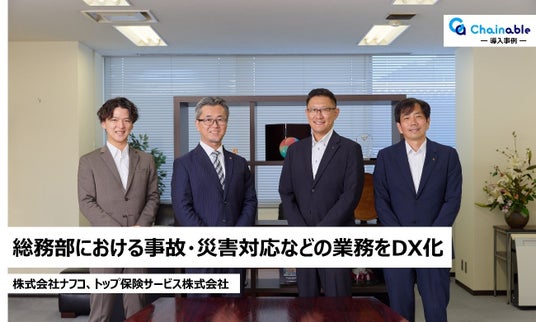 東京海上ディーアール(東京都千代田区、代表取締役:水野 一幸)は、提供するリスクコミュニケーションプラットフォームChainable(読み:チェイナブル、以下「Chainable」)の導入先として株式会社ナフコ、トップ保険サービス株式会社の事例を公開したことをお知らせいたします。