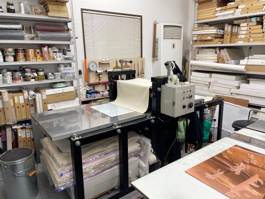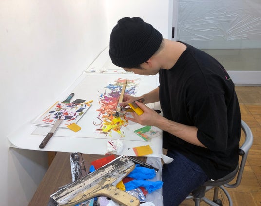 Many printmaking works are created in collaboration between artists and printmaking studios.
