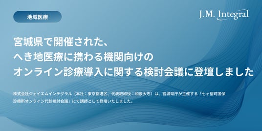 地域医療DXを支援する株式会社ジェイエムインテグラル(本社:東京都港区、代表取締役:和泉大志)は、宮城県庁が主催する「七ヶ宿町国保診療所オンライン代診検討会議」にて講師として登壇いたしました。本検討会議には、宮城県医療政策課、七ヶ宿町国保診療所、みやぎ県南中核病院、公立黒川病院などの県内へき地医療機関の関係者が参加しました。弊社は今後も、地域の実情に即したご支援を通じて、持続可能な地域医療の実現に貢献してまいります。