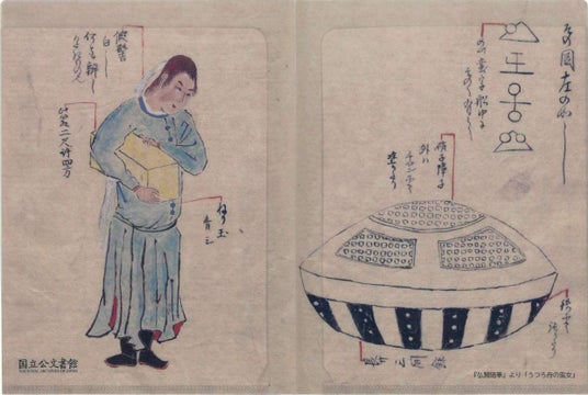 享和3年(1803)2月22日、常陸国に漂着したとされる舟です。漂着したのは、現在の茨城県神栖市波崎舎利浜(しゃりはま)ではないかと言われています。『弘賢随筆』の挿絵では、舟はUFOのような形で描かれています。そのほか、資料の記述によれば、記号のようなものが舟中に書かれ、長さは3間(約5.5メートル)あり、上はガラス障子で、底には鉄板がはめられていたといいます。中には水と食糧、そして一人の女性が乗っており、2尺四方(約60センチ四方)の箱を持っていたとのことです。