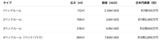 1ベッドルームでも80平方メートル を超えるゆとりある設計で、最大468平方メートル の大型ペントハウスまで展開しており、日本の都心物件と比べても圧倒的な広さを誇る点が大きな魅力です。
