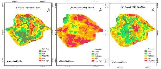 図2:研究対象地域において特定された潜在的リスクゾーン(左から、暴露要因、近接要因、HDCリスク総合マップ)