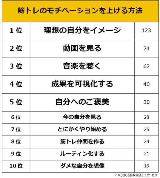 そこで今回、株式会社R&G( https://r-andg.jp/ )は、筋トレをしている男女500人に「筋トレのモチベーション」についてアンケート調査を実施。その結果をランキング形式でまとめました。