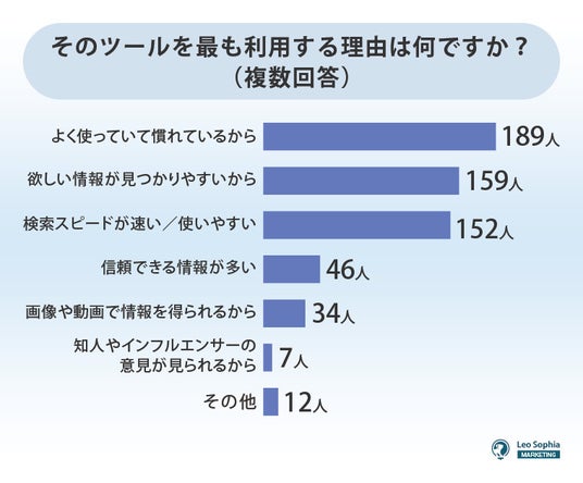 検索ツールの選択理由を調査した結果、「よく使っていて慣れているから」が189名で最多となりましたが、機能面では「欲しい情報が見つかりやすいから」と「検索スピードが速い/使いやすい」が上位を占め、実用性を重視する傾向が明確に表れています。