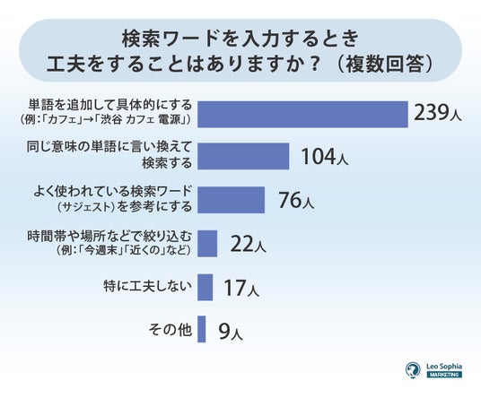 最も多く使われている技法は「単語を追加して具体的にする」で239名(79.67%)が実践しており、例えば「カフェ」から「渋谷 カフェ 電源」のように地域や条件を絞り込む手法が一般化していることが分かります。