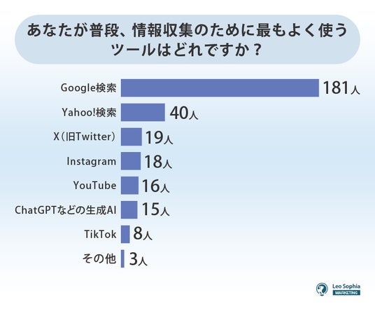 情報収集ツールの利用状況を調査した結果、Google検索が181名(60.33%)と圧倒的な支持を集めており、依然として検索の主流であることが確認されました。