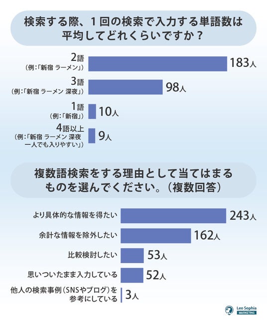 複数語検索をする理由については、「より具体的な情報を得たい」が243名と圧倒的多数を占め、「余計な情報を除外したい」162名がそれに続きました。
