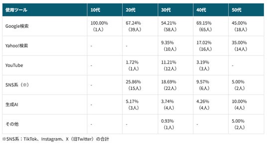 20代はX(旧Twitter)・TikTok・InstagramといったSNS系ツールの利用率が他世代より高い傾向を示している一方、50代ではYahoo!検索35.00%と高い数値となっており、従来型の検索エンジンへの依存度が高いことが分かります。