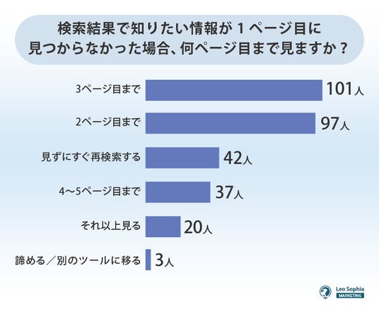 検索結果の閲覧継続に関して尋ねたところ、3ページ目まで確認するユーザーが全体の66%を占め、SEO対策において上位3ページ以内への表示が重要であることが数値で裏付けられました。