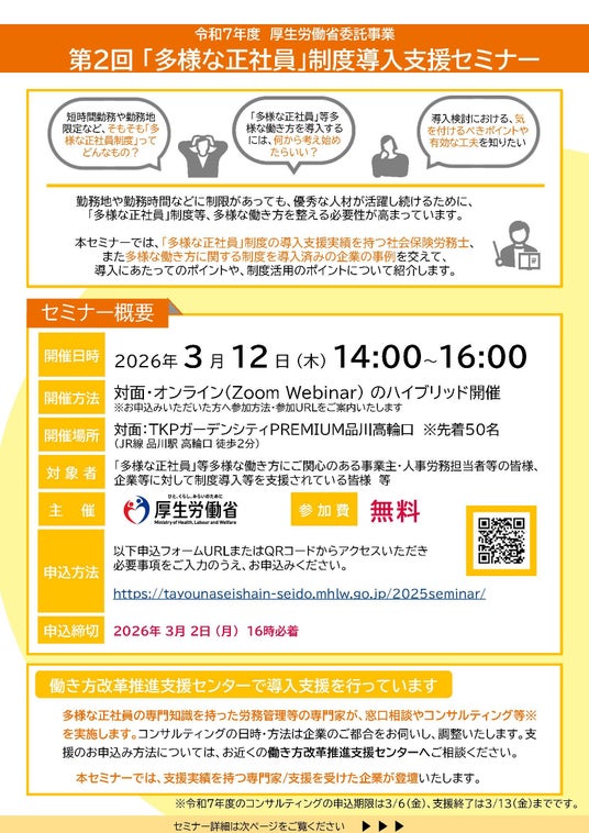 株式会社三菱総合研究所は、厚生労働省委託事業「令和7年度『多様な正社員』等の多様な働き方の実現のための環境整備の推進事業」の一環として、第2回「多様な正社員」制度導入支援セミナー(対面・オンライン)を開催いたします。