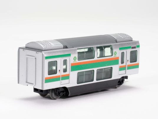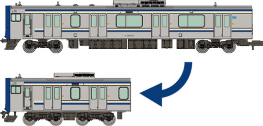 実車の1/150スケールを基本に、車体の長さ方向のみを実物の約半分にしており、省スペースで並べて飾ることができます。Nゲージサイズの彩色済み組立キットとして提供され、別売の動力ユニットを組み込むことでNゲージの線路上を走行させることも可能です。また、台車部分は展示時のリアルな見映えを重視した4軸仕様と、走行用に最適化された2軸仕様を選択でき、用途に応じて組み替えが可能です。