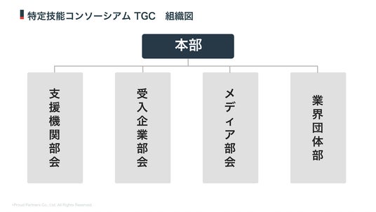 「特定技能コンソーシアム」は、本部、支援機関部会、受入企業部会等で構成し、在留資格ごとの実態把握と制度設計の高度化に向けた実態データの収集・分析、業界横断での情報整理およびレポートの公開、各分野における「あるべき受入の姿」の定義と標準化、政策提言および制度改善に向けた意見発信等を主な活動として予定しております(詳細は後述)。