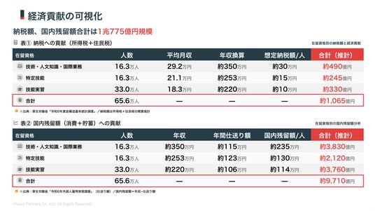 - 国内残留額/人(表2.): 年収換算額から年間仕送り額を差し引いた金額。日本国内での消費・貯蓄に充てられると想定される額。貯蓄分も国内金融機関に留まる限り国内経済に残るため、「国内残留額」と表記。