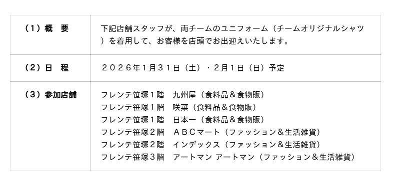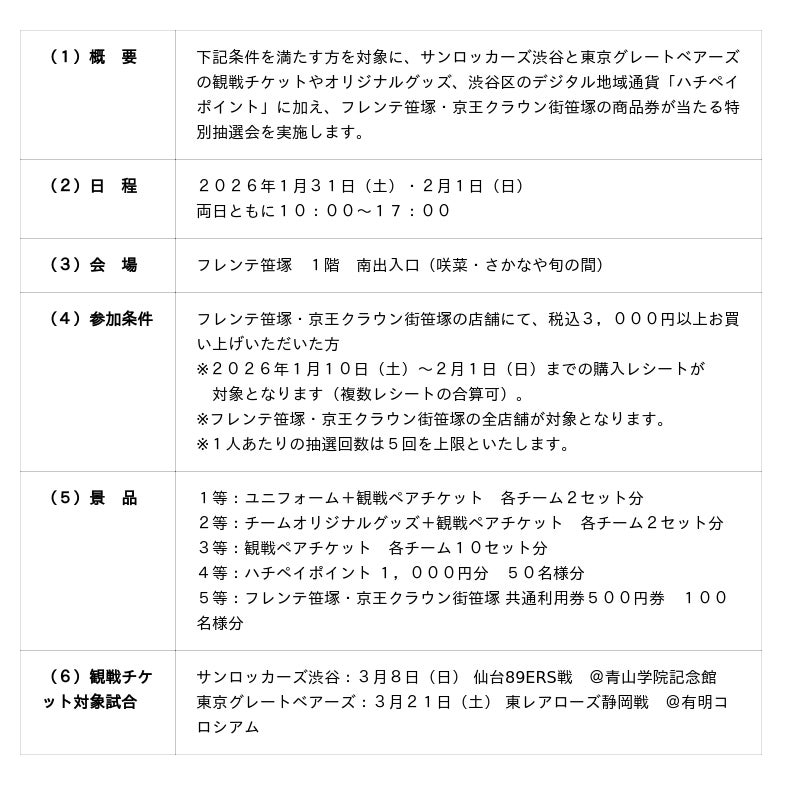 株式会社京王SCクリエイション(本社:東京都多摩市、代表取締役社長:小堺 健司)は、男子プロバスケットボールリーグ「B.LEAGUE」所属のサンロッカーズ渋谷と、男子プロバレーボールリーグ「SV.LEAGUE」所属の東京グレートベアーズと連携して、2026年1月31日(土)・2月1日(日)にフレンテ笹塚・京王クラウン街笹塚でお買い上げいただいた方を対象に、観戦チケットやチームオリジナルグッズ等が当たる特別抽選を実施いたします。特別抽選会当日には、フレンテ笹塚の一部店舗のスタッフが、両チームのユニフォーム(チームオリジナルシャツ)を着用してお客様をお出迎えする他、フレンテ笹塚出入口付近に、フレンテ笹塚内のアパレル店舗と連携して、観戦コーデを展示いたします。