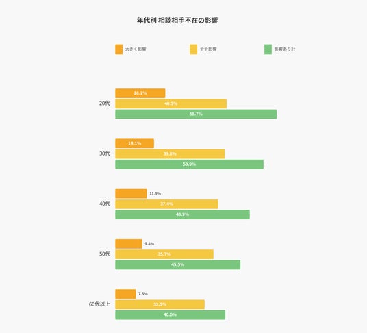年代別に影響度を見ると、若年層ほど相談相手がいないことによる影響を強く受けている傾向が顕著に現れました。