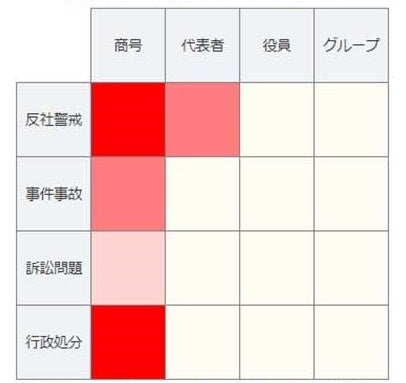 (2)リスクを色分け表示するからぱっと見で判断しやすい反社チェックヒートマップは、4つの情報区分(反社警戒、事件事故、訴訟問題、行政処分)と4つの法人・個人区分(商号、代表者、役員、グループ)を組み合わせた4×4の16マスで表示します。情報の重要性と該当件数に基づいて5段階に色分けされており、リスクが高まるにつれて濃い色で表示されます。色が付いたマスをクリックすると詳細情報が確認できます。