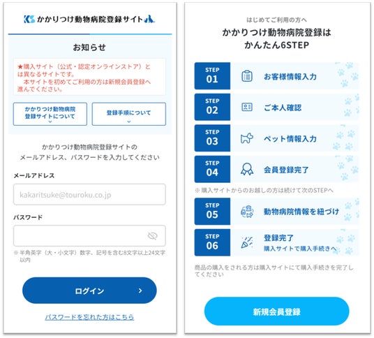 購入に際しては、当サイトでペット情報やかかりつけ動物病院の情報を入力する必要があります。これにより、獣医師による適切な栄養指導を受けた方のみ、購入できるようになり、大切な家族である犬・猫の健康を守ることにつながります。