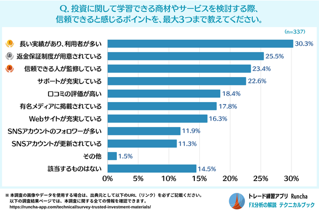 テクニカル分析専門サイト『テクニカルブック』は、信頼される投資の学習教材の条件について調査する目的で、過去1年間に投資詐欺と接触経験のある20歳以上の男女337名を対象にアンケートを行いました。本調査からは、投資の学習教材を選ぶ際にはサービス実績が最も重視されることがわかりました。