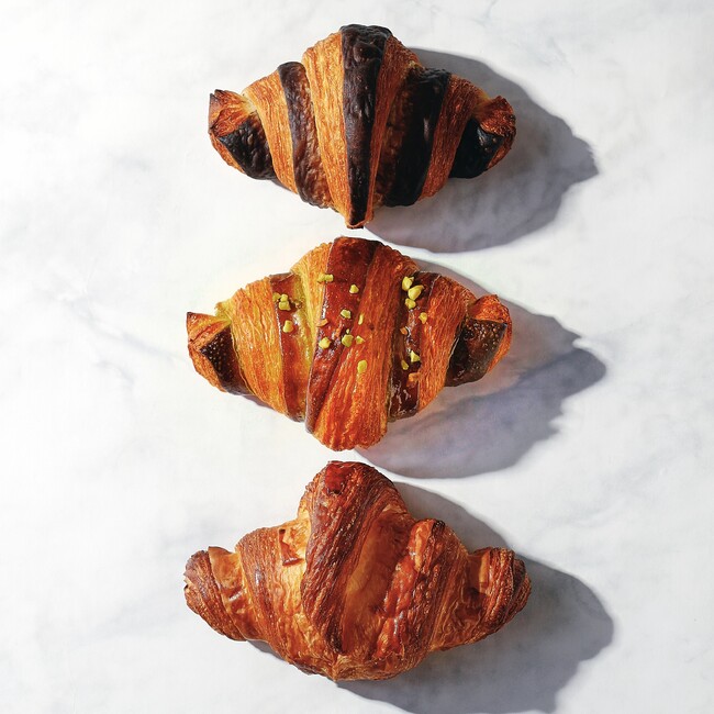 フランス産の2種類の小麦粉をブレンドした生地にフランス産発酵バターを折り込み、外はパリッ、中はしっとり焼き上げました。芳醇なバターの香りをお楽しみいただけます。